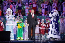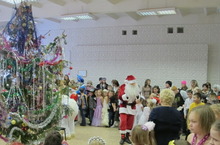 В актовом зале рапсоложились олимпийские представители, приехал Дедушка Мороз а за ним Снегурочка, елку зажигают, детей удивляют.