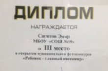 Ученик 2 В класса Сагитов Эмир награжден Дипломом 3 степени в фотоконкурсе "Ребенок главный пассажир"