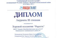 3 апреля во Дворце творчества детей и молодёжи имени Садыкова прошла торжественная церемония награждения победителей и призёров муниципального детского вокально-хорового конкурса «Серебряный колокольчик-2015», посвящённого 70-летию Великой Победы. Наш школьный хор «Радость» заняли почетное 3 место!!!
