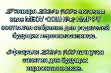 27 января 2024 г. в 9 ч. в актовом зале школы №2 состоится собрание для родителей будущих первоклассников. (Вход в школу в бахилах) Занятия с будущими первоклассниками начнутся 3 февраля 2024 г. На занятия необходимо принести простой карандаш, цветные карандаши, ручку, вторую обувь. Начало занятий в 9 часов.