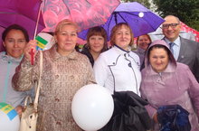 Демонстрация в честь Дня города. Учителя СОШ №20 в первых рядах. Им не страшен и дождь и ветер, улыбки на их лицах.
