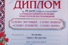 Поздравляем!Хузятову Ларису Валерьевну, за получения 3 места Х открытого конкурса на лучшее чтение поэтических произведений(чтение на татарском языке).
