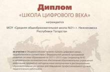 Дипломом "Школа цифрового века" награждено МБОУ "Средняя общеобразоватедьная школа №21" г. Нижнекамска Республики Татарстан