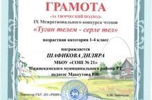 Ученица 2 Б класса 21 школы Шафикова Диляра-участница межрегионального конкурса "Туган телем- серле тел" в номинации "Әткәм-әнкәм йорты " со стихотворением ветерана-учителя школы Анастасии Тимофеевны Усачевой "Әни булса гына!"
