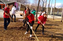 Очередной субботник, 7 классы раскидывают снег с газонов