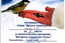 17-18 ноября 2016 года в Детском эколого-биологическом центре прошло муниципальное экологическое мероприятие «Встреча зимующих птиц», ставшее началом экологической акции «Покормите птиц зимой!», которая продлится до 1 апреля. Организаторами праздника стали ДЭБЦ и управление образования Исполнительного комитета НМР. Главная цель мероприятия – привлечение внимания школьников к проблеме зимующих птиц, пропаганда природоохранной деятельности среди школьников и развитие творческих способностей детей. Праздник проходил в четыре этапа, где свои знания и способности показывали команды из пяти человек. Ребята хорошо показали свои знания в теоретическом туре «Растения и животные нашего леса», в правилах подкормки птиц. Все участники проходили компьютерное тестирование «Зимующие птицы» и участвовали в конкурсе чтецов «Птичья поэзия». Наш школьный отряд "Друзья природы" под руководоством Симачковой Любовь Михайловной, заняли 3 место в данном мероприятии и были награждены грамотой управления образования Исполнительного комитета НМР РТ. Поздравляем!