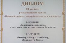 Поздравляем Усманова Алмаза, ученика 3 Б класса, занявшего 3 место в республиканском турнире "Цифровой прорыв - вектор безопасности и успешности" в номинации "Компьютерная графика". Руководитель: Нуруллина Гульнара Гильфановна.