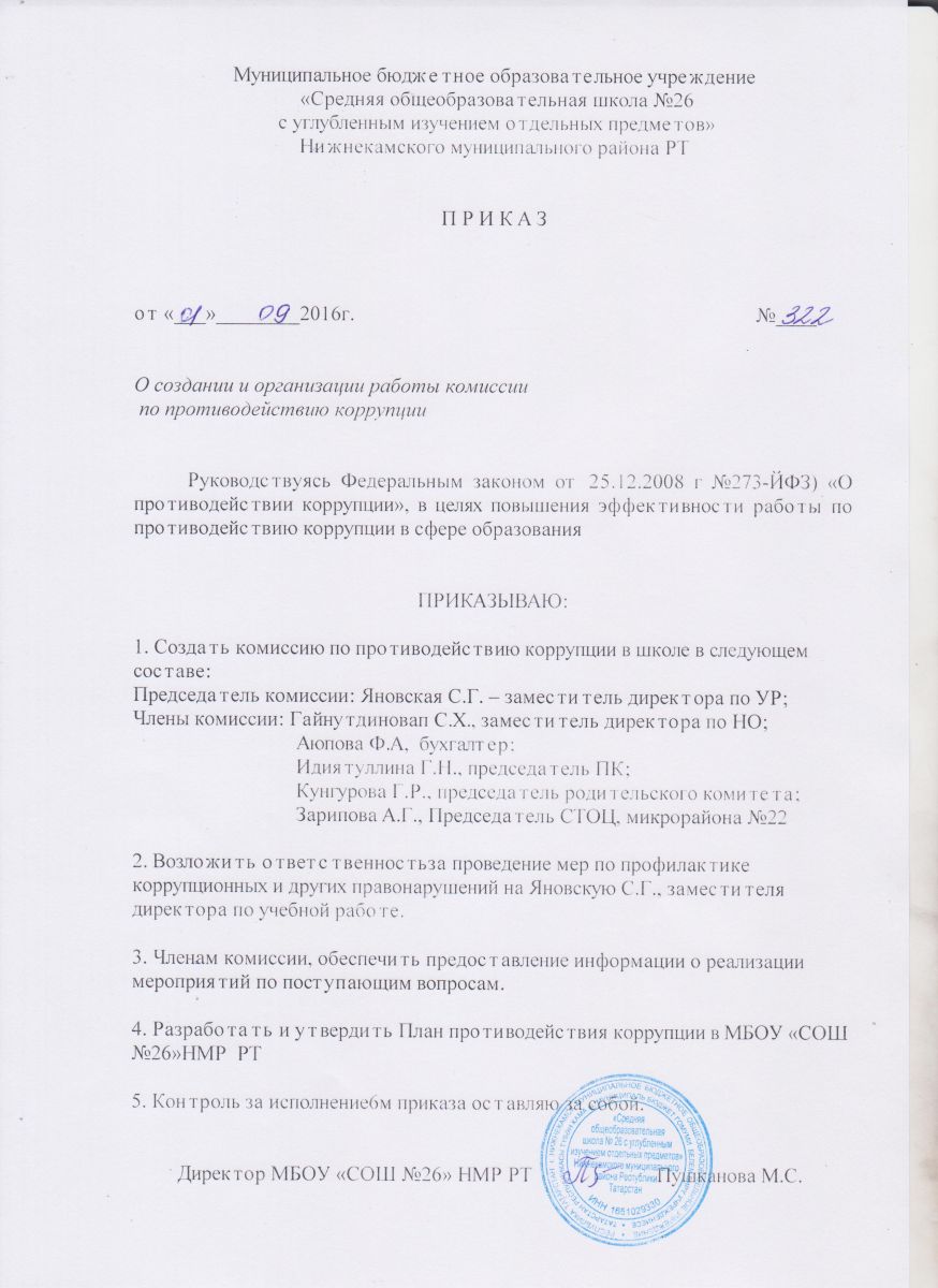 Приказ о создании комиссии по противодействию коррупции №322 от 01.09.2016 года