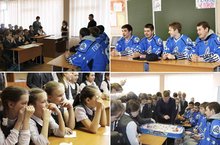 В гости к 5А классу пришли необычные гости - "великолепная тройка и вратарь" - Рафаэль Бикмуллин, Павел Порядин, Роман Голованов и Александр Володин-лидеры ХК "Реактор".