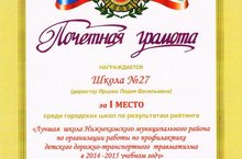 Школа №27 признана лучшей школой НМР РТ по организации работы по профилактике детского дорожно-транспортного травматизма в 2014-2015 учебном году. С этой заслуженной победой школу поздравил начальник ОГИБДД УМВД РФ, подполковник полиции А.Г. Крайнов. Поздравляем всех, кто активно принимал участие в работе по профилактике ДТТ. Молодцы!