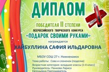 Поздравляем ученицу 4Б класса Хайбуллину Сафию победителя всероссийского творческого конкурса "Подарок своими руками".