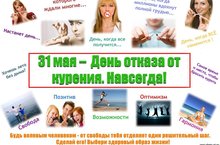 На Земле целых два международных дня, посвященных борьбе с курением – Всемирный день без табака (31 мая) и Международный день отказа от курения, который отмечается ежегодно в третий четверг ноября. Первая из этих дат установлена Всемирной организацией здравоохранения в 1988 году, вторая появилась даже раньше – в 1977 году, по решению Американского онкологического общества. Мы - за здоровый образ жизни! Будем здоровы!