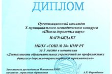 Наша школа награждена дипломом за 3 место в номинации «Деятельность образовательных учреждений по профилактике детского дорожно-транспортного травматизма» в X муниципальном методическом конкурсе «Школа дорожных наук». Поздравляем!