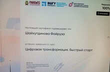 Поздравляем заместителя директора по воспитательной работе Шайхутдинову Ф.В. с успешным завершением курса. Файруза Валимухаметовна получила сертификат по курсу Цифровая трансформация. Быстрый старт и входит в 46% лучших студентов, которые прошли курс полностью. Поздравляем! Так держать! Мы гордимся вашими результатами!