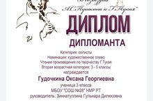 Поздравляем ученицу 3А класса Гудочкину Оксану (классный руководитель Зиннатуллина Г.Д.) – дипломанта Республиканского творческого конкурса «В созвездии А.С.Пушкина и Г.Тукая». Оксана, молодец! Школа гордится твоими успехами!