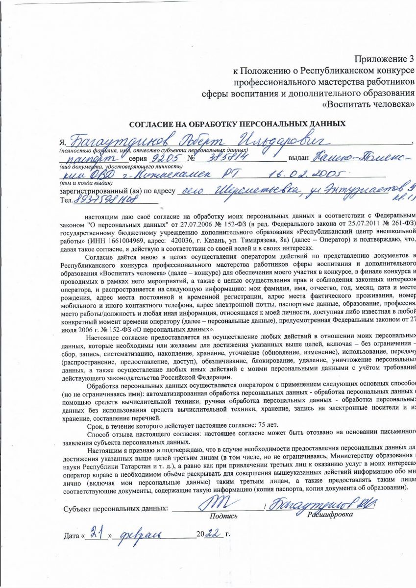 Заявка и согласие участника Конкурса на обработку персональных данных