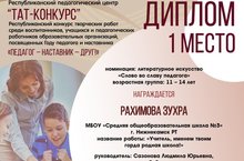 Поздравляем ученицу 7 "В" класса Рахимову Зухру, занявшую 1 место в Республиканском конкурсе творческих работ, посвященных Году педагога и наставника "Педагог - Наставник - Друг!" в номинации "Слово во славу педагога" (руководитель педагог-библиотекарь Сазонова Л.Ю.). Желаем Зухре дальнейших творческих успехов и побед!