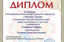 Дипломом I степени II Республиканского конкурса детского творчества "Читаем Тукая" в номинации "Художественное слово" среди участников от 7 до 12 лет награждена ученица 2"Г" класса нашей школы Хазиева Сабина (руководитель Хасанова Л.М.). Молодец!