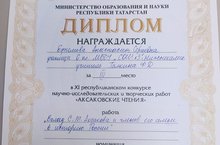 Поздравляем ученицу 6"Б" класса Ефимову Анастасию, занявшую 3 место в XI Республиканском конкурсе научно-исследовательских и творческих работ "Аксаковские чтения" в номинации "Слово Аксаковых в истории России" (руководитель Галкина Ф.Д.). Желаем Насте и её руководителю новых творческих идей, проектов и побед!
