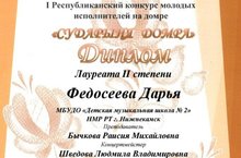 Поздравляем ученицу 5 "Б" класса Федосееву Дарью, Лауреата II степени в I Республиканском конкурсе молодых исполнителей на домре "Сударыня домра". Молодец, Даша!