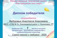 Дипломом победителя в Международном творческом проекте "Как прекрасен этот мир!" награждены ученица 9 "А" класса Федоровых Анастасия (руководитель Галкина О.А.) и ученица 3 "Г" класса Советова Валентина (руководитель Никонорова Е.В.). Наши учащиеся заняли 1 место в конкурсе декоративно-прикладного творчества и изобразительного искусства "Самой нежной и любимой - 2020". Поздравляем!