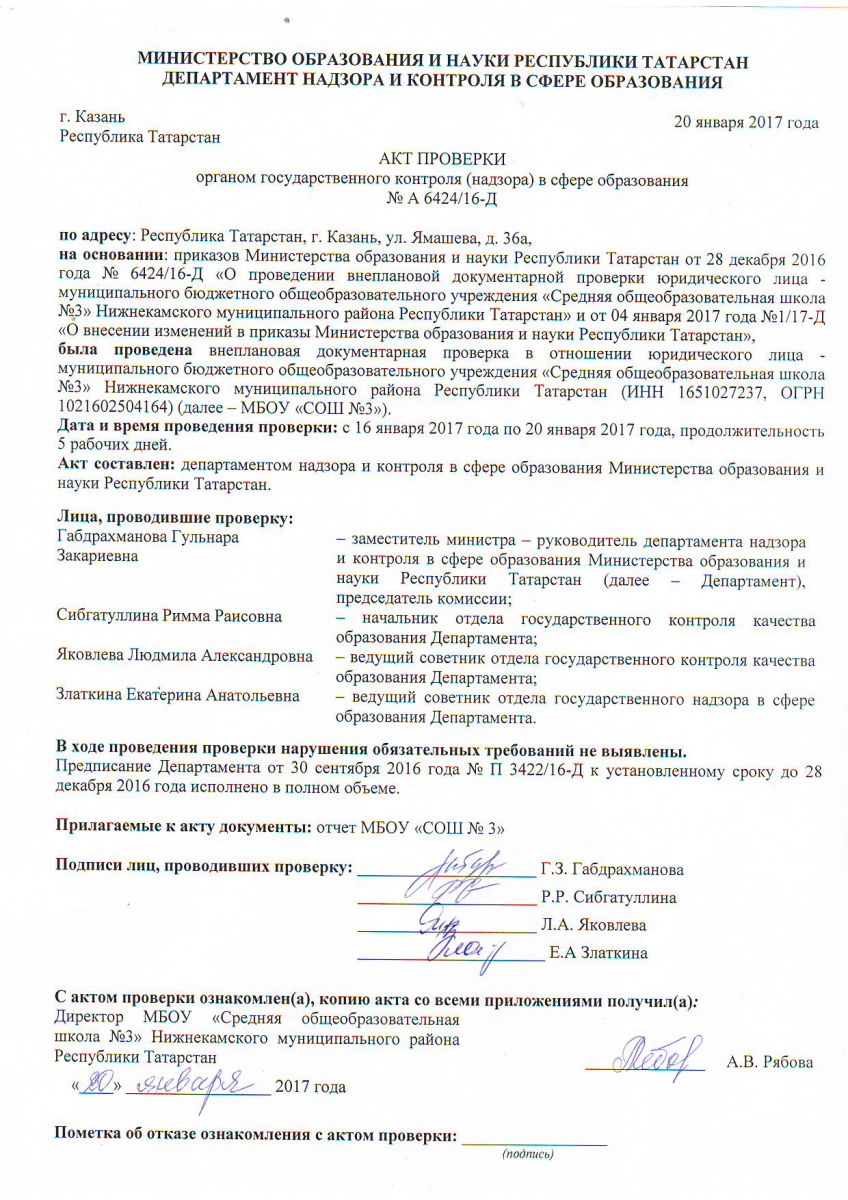 Уведомление об исполнении предписания МБОУ "СОШ № 3" Нижнекамского района