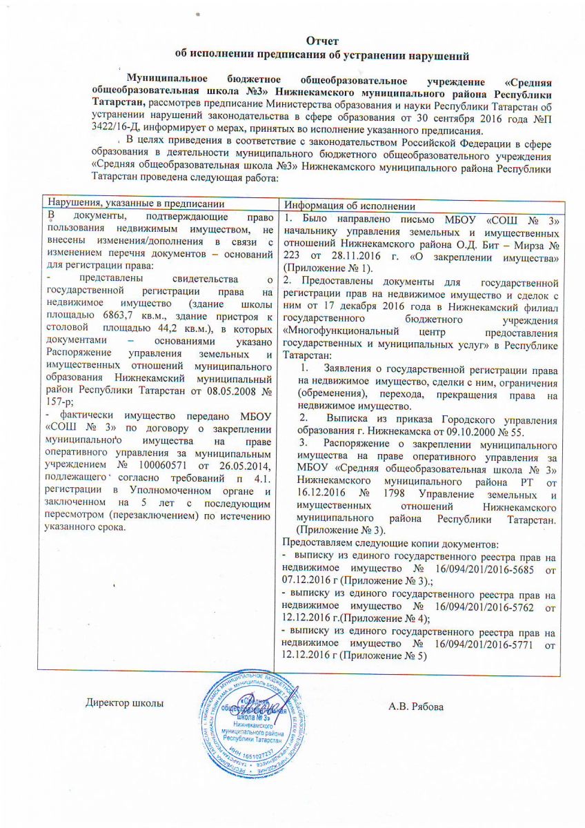Отчет об исполнении предписания от 30 сентября 2016 года.