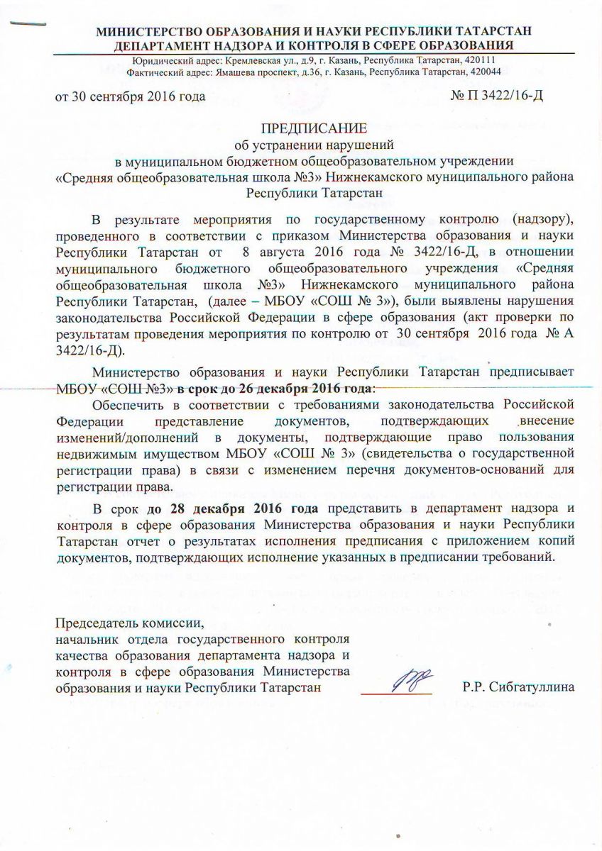 Предписание органов, осуществляющих контроль от 30 сентября 2016 года.