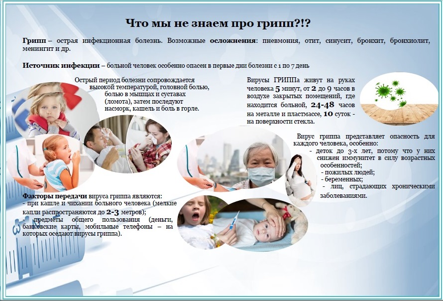 Грипп — это инфекционное заболевание, заболеть которым может любой человек. При гриппе обостряются имеющиеся хронические заболевания, кроме этого, грипп имеет обширный список возможных осложнений: