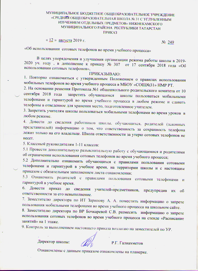 Приказ "Об использовании сотовых телефонов во время учебного процесса"