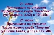 21 июня приглашаем на открытие подростковых клубов! 20.06.2019