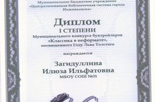 Ученица нашей школы Загидуллина Илюза награждена дипломом I степени и ценными подарками образовательного характера в муниципальном конкурсе буктрейлеров "Классика в неформате", посвященного Году Льва Толстого, который проходил МБУ "ЦБС г.Нижнекамска". Учителя: Кудряшова Т.М. и Ямщикова Р.Ю. Поздравляем!