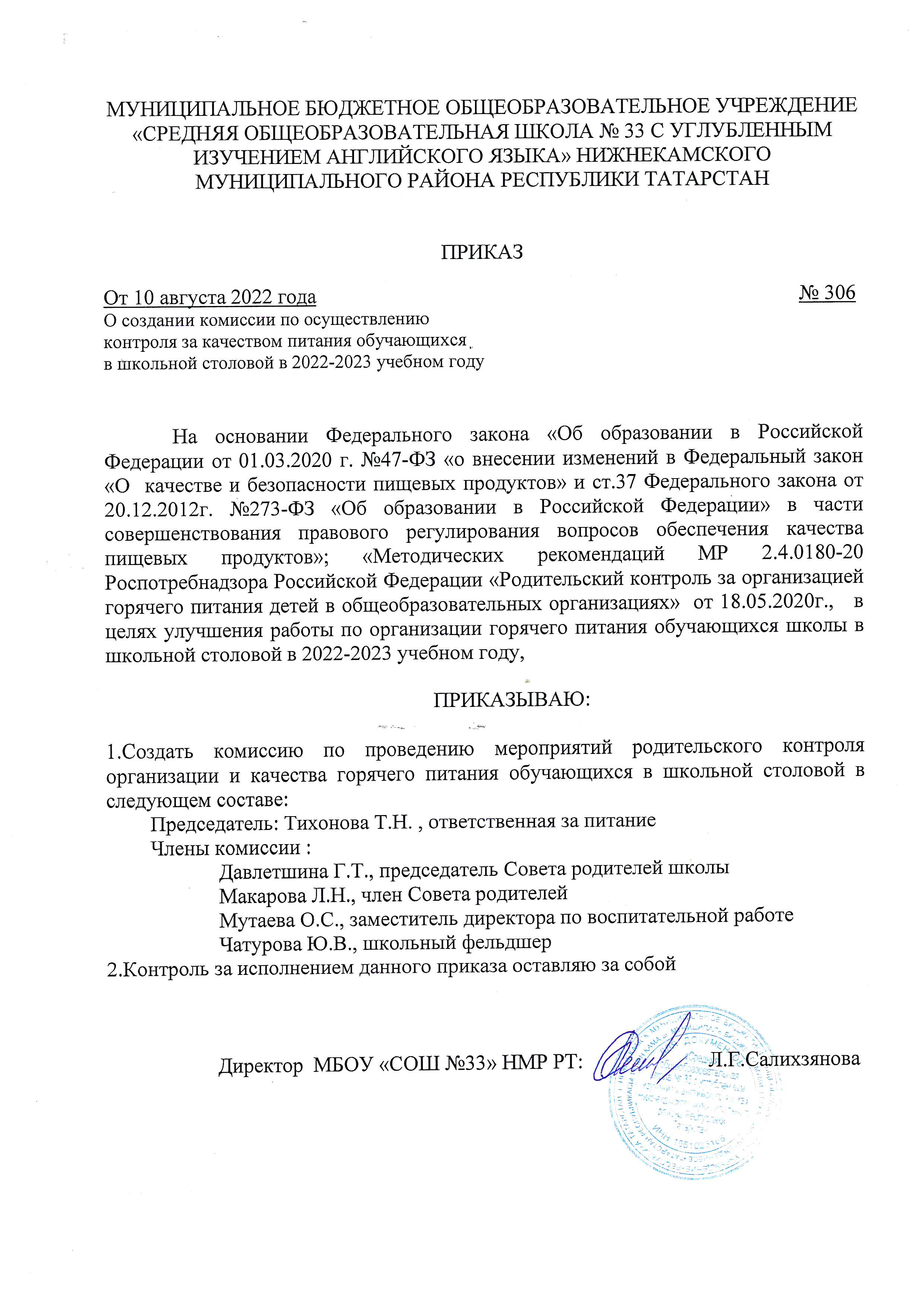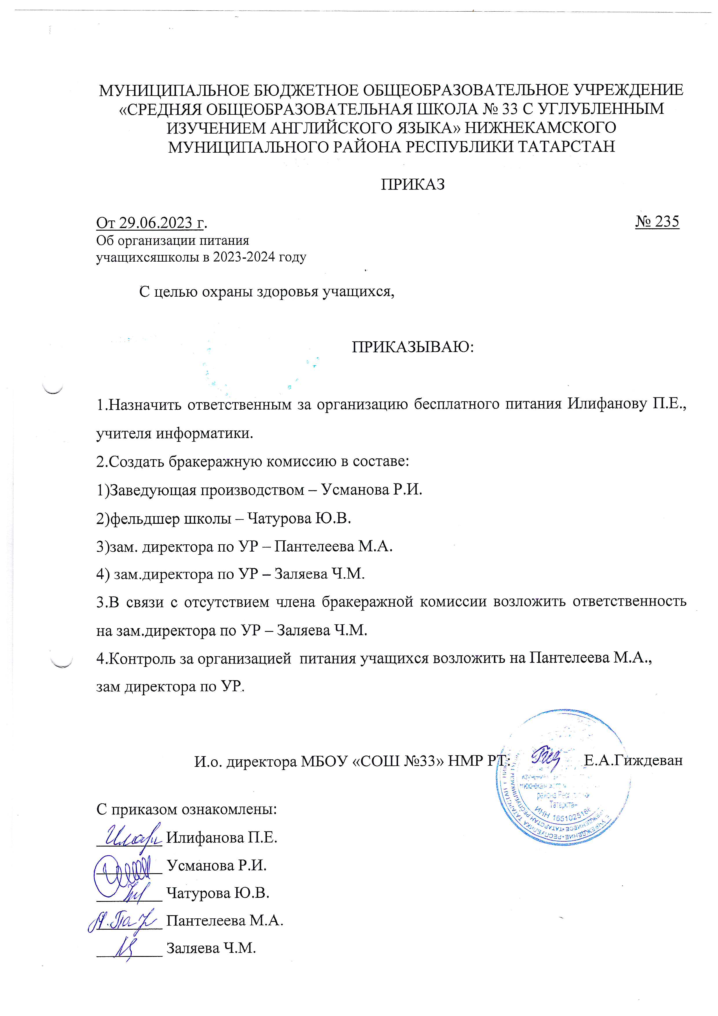 Приказ об организации питания учащихся в школе на 2023-2024 учебный год
