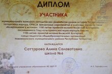 Диплом участника муниципального конкурса методических разработок уроков истории Татарстана и татарского народа, ОРКСЭ, внеурочных мероприятий и классных часов, посвященных Году культурного наследия народов России, 1100-летию принятия ислама Волжской Булгарией, награждёна учитель английского языка школы №6 Саттарова Алина Салаватовна.