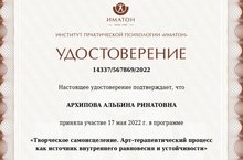 17 мая педагог-психолог Архипова Альбина Ринатовна побывала на открытом мастер-классе «Творческое самоисцеление. Арт-терапевтический процесс как источник внутреннего равновесия и устойчивости», где известный специалист из Литвы - Вида Григалюнайте (дипломированный арт-педагог и арт-терапевт, член арт-терапевтической ассоциации Литвы) поделилась собственным опытом актуализации исцеляющего творческого процесса.