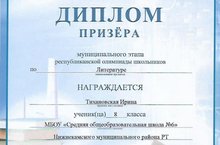 Поздравляем Тихановскую Ирину - призера муниципального этапа Всероссийской олимпиады школьников по литературе (учитель Гимадеева Ляля Мунировна).
