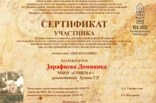 Поздравляем Зарафиеву Доминику, участника муниципального конкурса презентаций и видеороликов «Путеводитель по историческим и культурным местам Республики Татарстан, посвященного Году культурного наследия народов России, 1100-летию принятия ислама Волжской Булгарией» (учитель Хузина Гульнара Рафиловна).