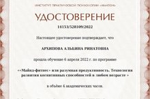 Психолог школы №6 Архипова Альбина Ринатовна прошла обучение по программе "Майнд-фитнес или разумная продуктивность. Технология развития когнитивных способностей в любом возрасте".
