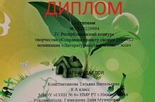 Дипломом первой степени Республиканского конкурса творчества "Сохраним планету своими руками", в номинации "Литературное творчество - эссе" награждена ученица 8А класса школы №6 Константинова Татьяна (учитель Гимадеева Ляля Мунировна).