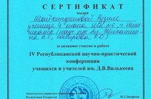 Шайхутдинова Рузиля, ученица 4А класса школы №6 приняла участие в Республиканской научно-практической конференции учащихся и учителей им. Д.В.Вилькеева.