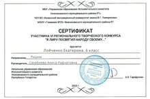 Сертификат участника регионального творческого конкурса "Я лиру посвятил народу своему" получила Лойченко Екатерина (учитель Сахабиева Аниса Рафкатовна).