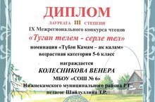 Поздравляем обучающуюся 5А класса школы №6 Колесникову Венеру, лауреата третьей степени Межрегионального конкурса чтецов "Туган телем - серле тел" (учитель Шайдуллина Танзиля Рахимулловна).