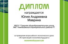Учитель биологии Маврина Юлия Андреевна получила диплом за организацию Всероссийского экологического урока "История вещей и экономика будущего".