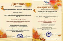 Поздравляем Вершинину Виоллету, обучающуюся 6"б" класса с победой во втором Всероссийском конкурсе чтецов "Золотая осень". Учитель Гимадеева Ляля Мунировна