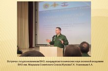 Обучающиеся 10 класса нашей школы приняли участие на встречи с подполковником ВКО, кандидатом технических наук военной академии ВКО им. Маршала Советского Союза Жукова Г.К. Ухановым А.А. Подполковник рассказал об условиях поступления в Военную акамедию ВКО. Свою историю Военная академия воздушно-космической обороны имени Маршала Советского Союза Г.К.Жукова ведет с 24 ноября 1956 года, перечень специальностей подготовки курсантов достаточно широк и, что еще более важно, абсолютно уникален, поскольку подготовка специалистов такого уровня и по таким специальностям не осуществляется больше нигде. Академия готовит военных интеллектуалов в области управления сложнейшими системами вооружений, используемыми для борьбы с современными системами воздушно-космического нападения зарубежных государств по 10 военным специальностям (из них по 2 военным специальностям с 2016 года академия осуществляет обучение девушек):