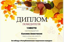 Поздравляем ученицу 9А класса Сысину Анастасию, ставшую победителем Республиканского творческого конкурса "Осенний карнавал" в номинации "Музыкальное творчество" (учитель музыки Нафикова Гульназ Райхановна).