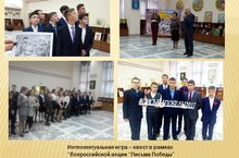 Во исполнении письма ООО “Пространство инноваций” руководителям исполнительной власти субъектов РФ, осуществляющих государственное управление в сфере образования и молодежной политики № 280 от 03 августа 2017 г. “О проведении Всероссийской патриотической акции “Письма Победы”, приказа управления образования исполнительног окомитета Нижнекамского муниципального района № 345 от 08.08.2017 “О реализации федерального партийного проекта “Историческая память” обучающиеся нашей школы приняли активное участие в игре –квест в рамках “Всероссийской акции “Письма Победы”, проводимой 4 сентября 2017 года в 14.00 на базе ДТДи М им И.Х.Садыкова.
