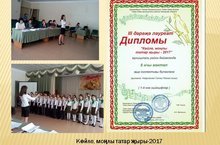 “Көйле, моңлы татар җыры-2017” муниципаль район бәйгесенә 4нче сыйныф укучыларыннан торган хор коллективы зур тырышлык куеп әзерләнде. 41 укучы “Шома бас”, “Гүзәл җирем” дигән җырларны күңел биреп өйрәнделәр. Хор коллективының чыгышы 8нче сыйныф укучысы Тюкаев Русланның баянда уйнауы белән алып барылды. Бу мәртәбәле бәйгегә укучыларны музыка укытучысы Нәфыйкова Гөлназ Рәйхан кызы әзерләде.Җаваплы чарада ШәйдуллинаТәнзилә Рәхим кызы, Сафонова Илсөя Нурислам кызы да үзләреннән өлеш керттеләр.