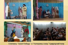 В преддверии празднования 72-ой годовщины великой победы для учащихся 1-4 классов артистами драматического исторического театра “Удмуртия” был показан спектакль “Катюшины слезы”, для старших классов – спектакль “Салют Победы”. Слдедует отметить артистическое мастерство итсполения, вокальные и хореографические номера, в спекталях представлены музейные экспонаты времен второй мировой войны. Данные спектакли имеют большое значения в рамках гражданско –патриотического воспитания молодежи.