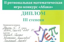 Команды обучающихся 5-7 классов нашей школы приняли участие во II региональной математической игре – конкурсе «Абака». Команды готовили учителя математики Дорофеева Л.И. , Минегалиева Р.Х. Команда учащихся «Эврика -6» в составе Окунева Романа, Зиганшина Дмитрия, Ситракова Алексея, Аблатыпова Дениса награждены Дипломом III степени. Руководитель команды - Дорофеева Лилия Ильинична. От всей души поздравляем Вас с победой. Желаем дальнейших успехов!!!
